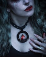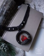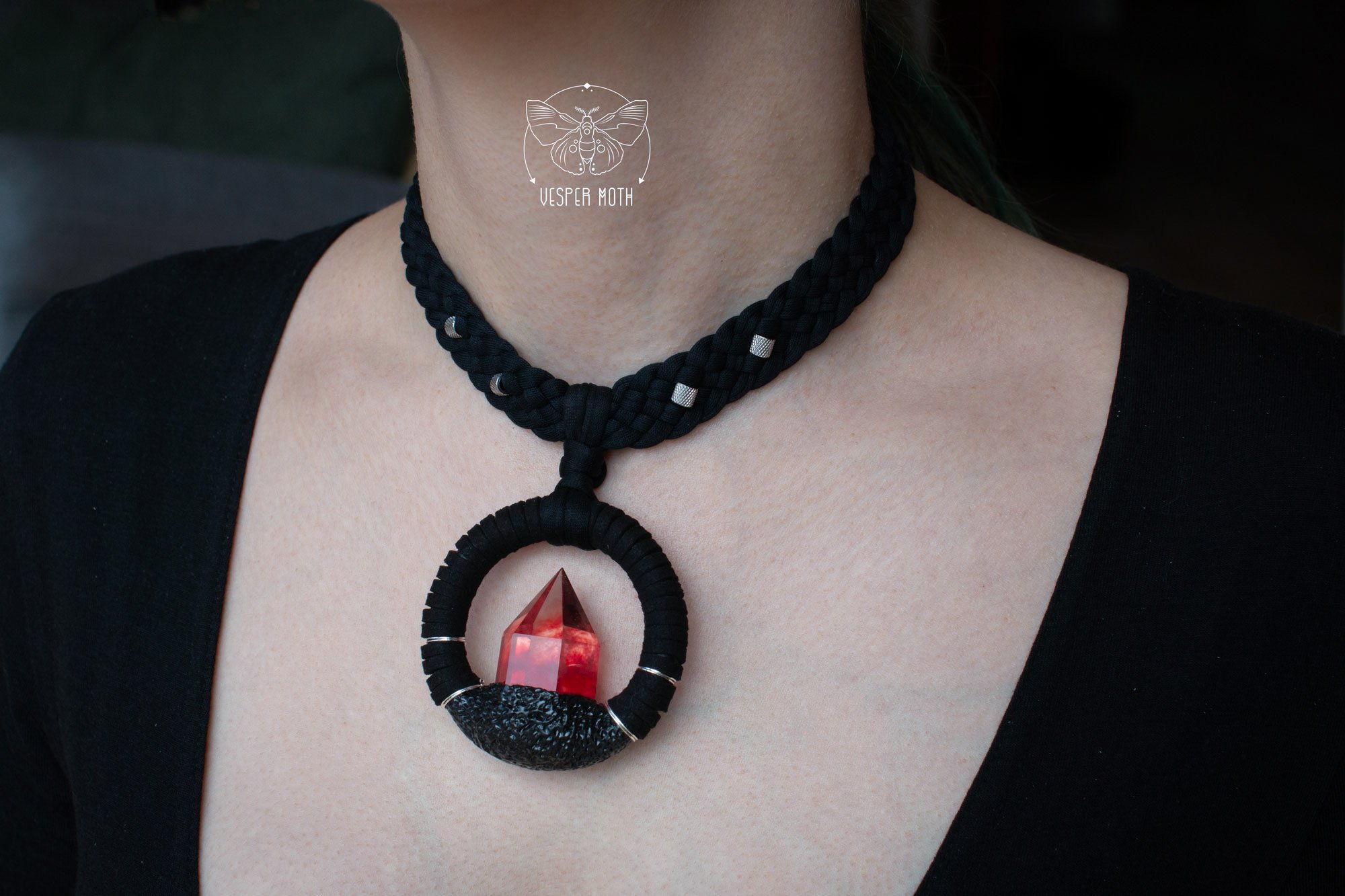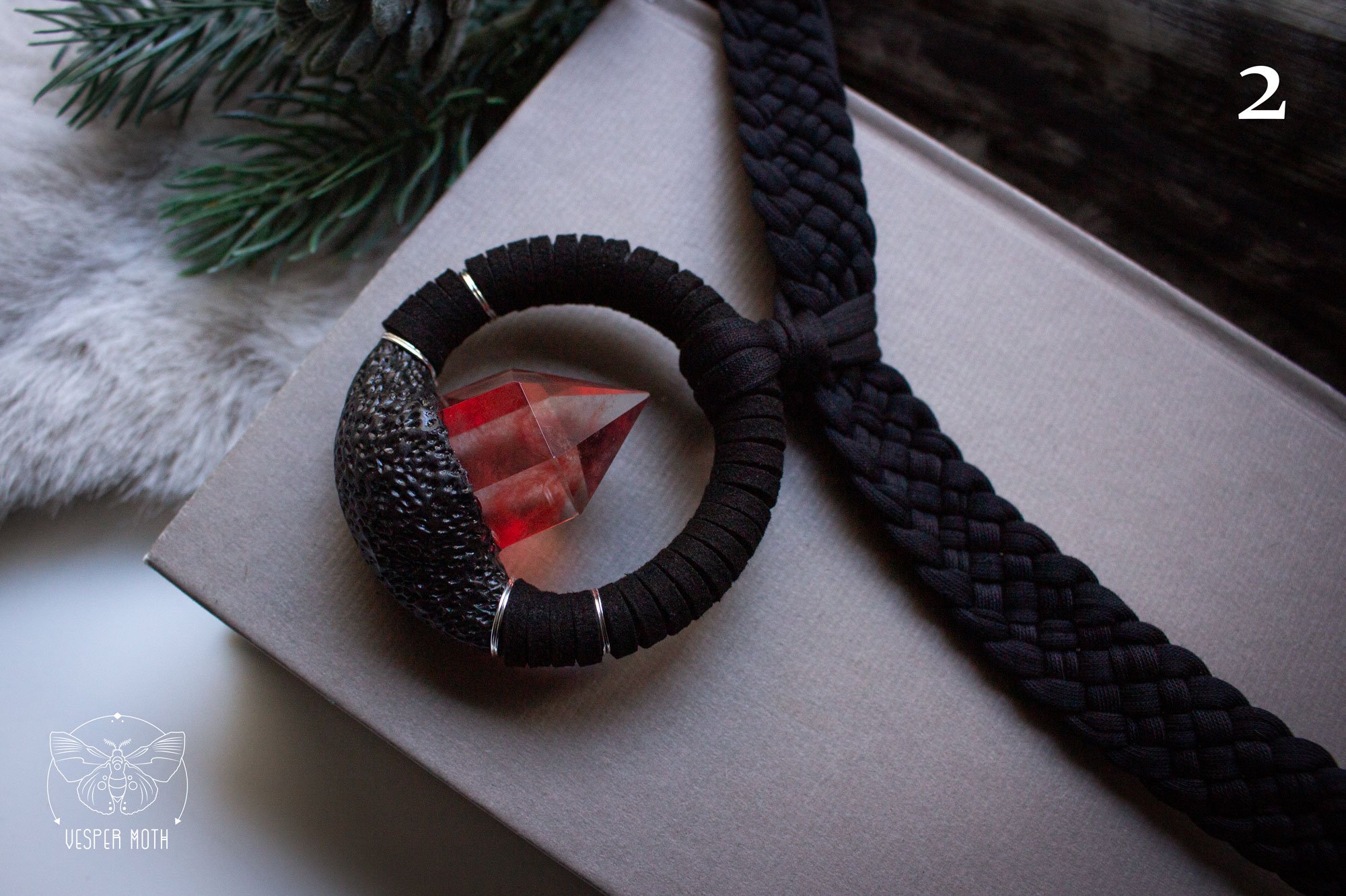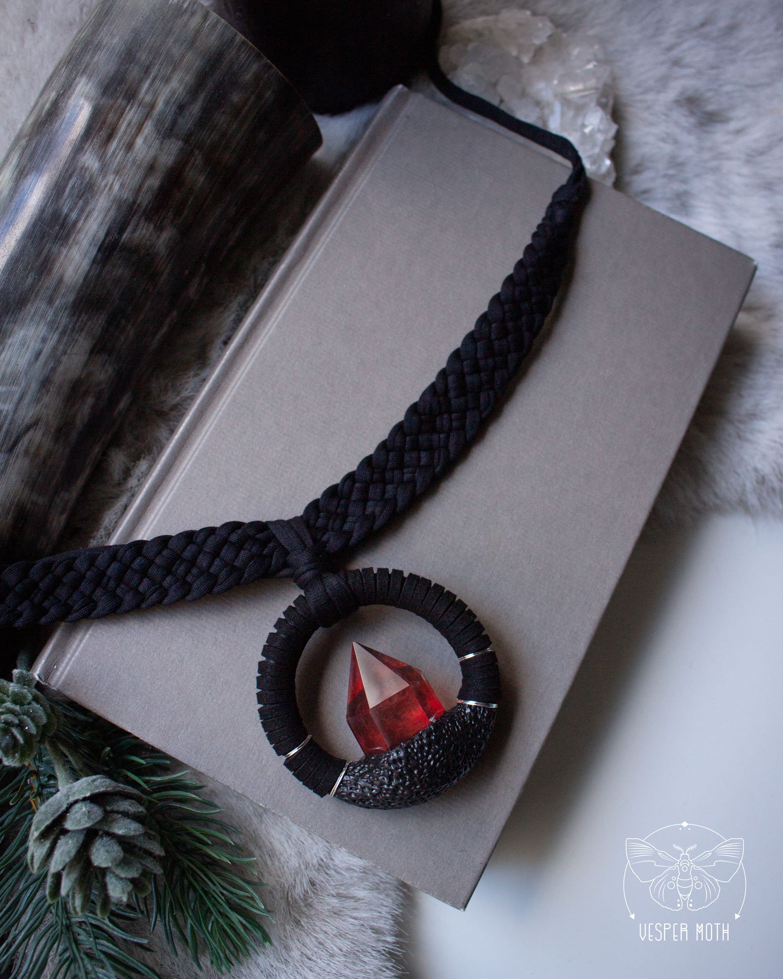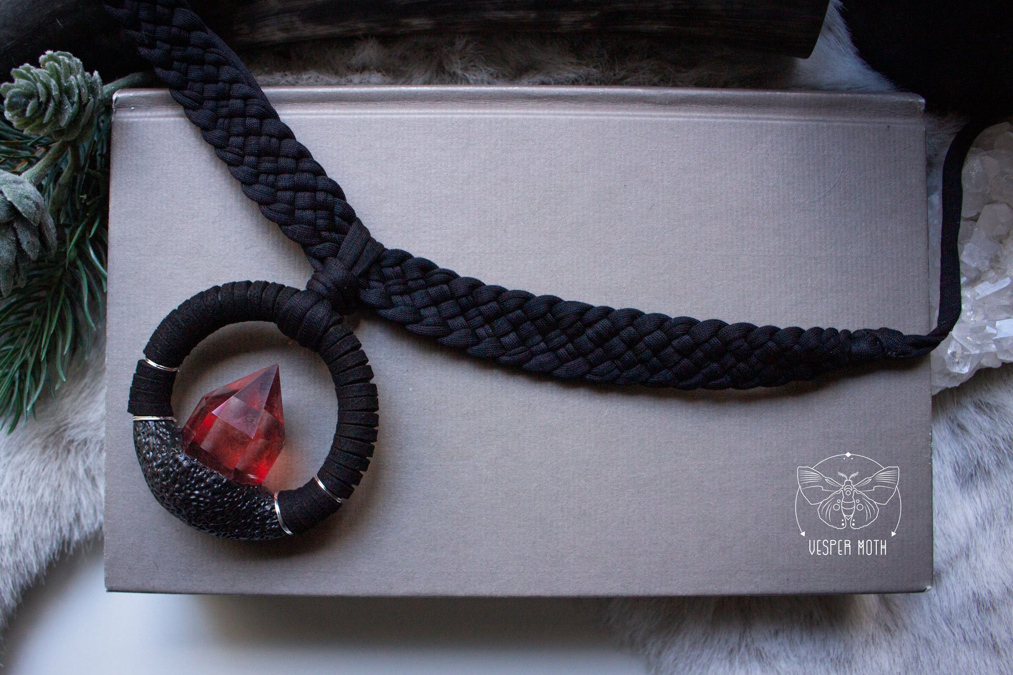 This beautiful statement piece and love child of Creations by Magi & Vesper Moth consists of a big red smelting quartz, rock settings formed out of polymer clay, 925 sterling silver wire ornaments and a long, black textile band. The braided sustainable textile fabric of this necklace was created by Creations by Magi. The Völvagamen Choker is a limited design.